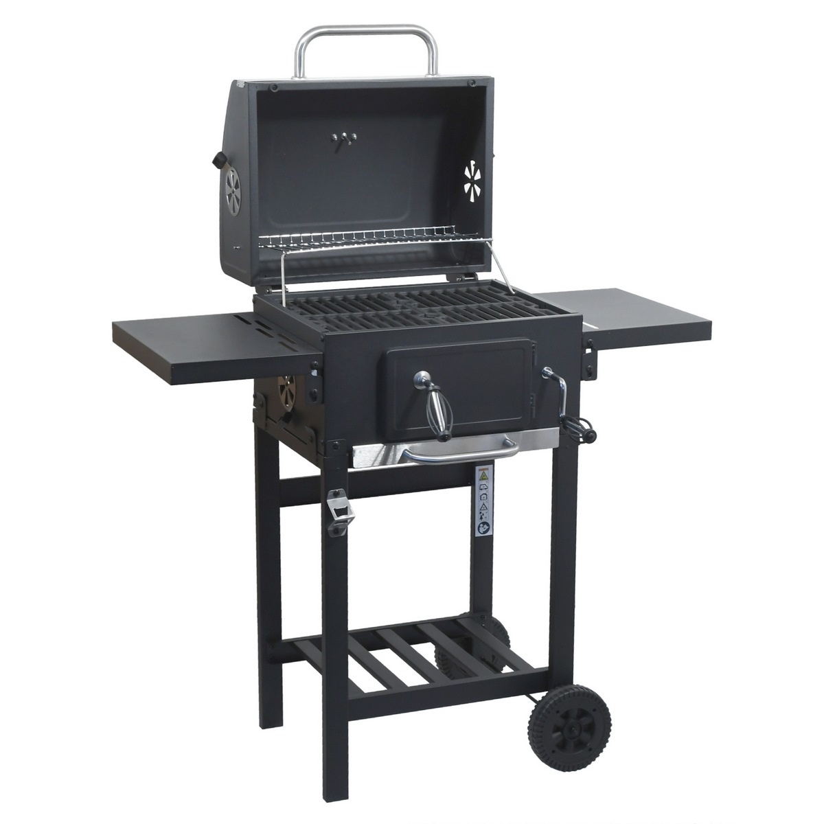 Tento propracovaný gril uspokojí i velmi náročné milovníky grilování. Vysoce stabilní konstrukce z precizně opracované oceli je opatřená odolnou, hrubě černou barvou. Je doplněna dvěma kolečky usnadňující mobilitu grilu. Rám ve spodní časti slouží pro další zvýšení stability a rovněž jako odkládací prostor. Boční strany jsou doplněny sklápěcími poličkami pro odkládání rozličného vybavení pro grilování, nebo samotných pokrmů.Ovládací kovové prvky a rukojeti mají dostatečné rozměry pro pohodlný úchop a zajišťují snadnou manipulaci. Oboustranná ocelová regulace ventilace perfektně lícuje s konstrukcí. Vyklápěcí víko je ve vrchní části opatřené teploměrem pro stálou kontrolu teplot uvnitř grilu. Pro samotnou tepelnou přípravu vašich pochutin je gril opatřen robustním, dvoudílným, litinovým roštem. Dále je grilovací prostor osazen odkládacím roštem pro udržení teploty již hotových pokrmů, nebo pro jejich předehřátí. Další předností grilu je rošt na uhlí s nastavitelnou výškou, grilovací prostor je tak možné regulovat pomocí mechanismu na přední straně, dle požadavků daných pokrmů. Dvířka na čelní straně grilu významně usnadňují doplňování uhlí. Pro usnadněné čištění je potom určena zásuvka na popel ve spodní části grilu.Technické parametry: