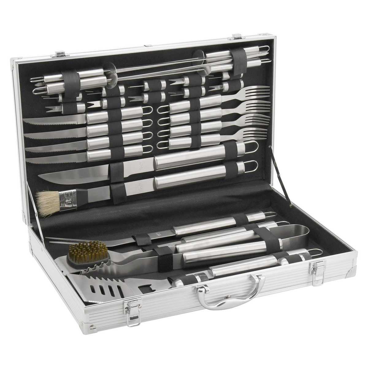Pořiďte si tuto profesionální sadu se vším, co potřebujete pro grilování. Obsahuje nástroje pro přípravu nejrůznějších pokrmů, ale i následnou údržbu grilu. Je úhledně umístěna v transportním aluminiovém kufru a hodí se pro náročné uživatele. Sadu využijete doma na zahradě, ale i na cestách. Obsah sady: