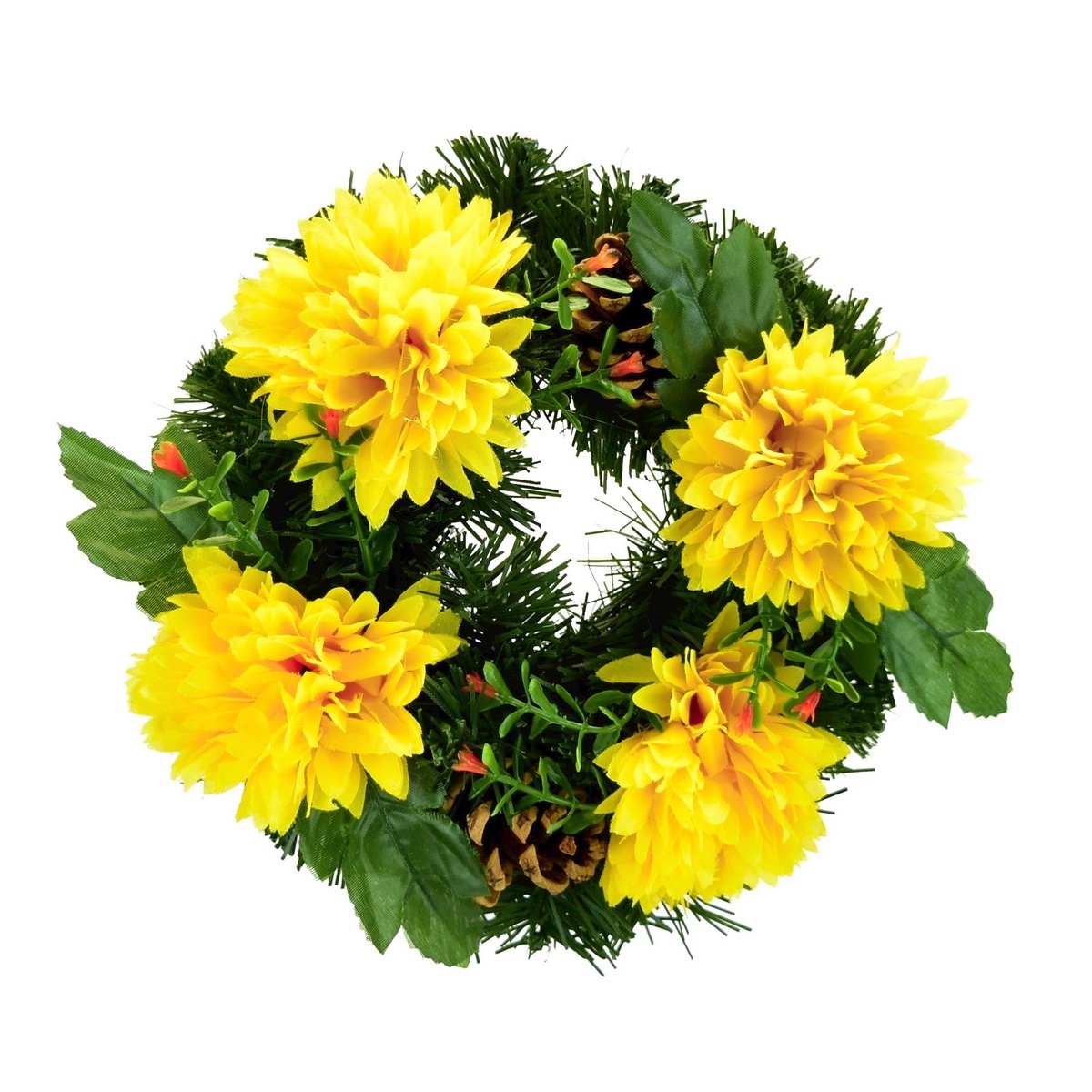 Věnec zdobený květy chryzantém je skvělou volbou pro podzimní dušičkovou výzdobu. Základem je umělé zelené jehličí doplněné žlutými chryzantémami, šiškami z borovice a větvičkami s kvítky, což dodává věnci jedinečný a realistický vzhled. Díky umělému materiálu a kvalitnímu zpracování vydrží věnec krásný několik let a stane se vaší bezúdržbovou výzdobou..